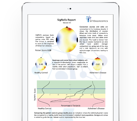 SigNeXx is a non-invasive, advanced electroencephalography(EEG)-based analysis tool, using standard EEG acquisition devices that provides an objective measure of brain connectivity. It will provide a data-analysis tool that delivers a quantitative evaluation of standard EEG recordings to aid in the diagnosis and monitoring of patients with dementia, in particular Alzheimer’s Disease.