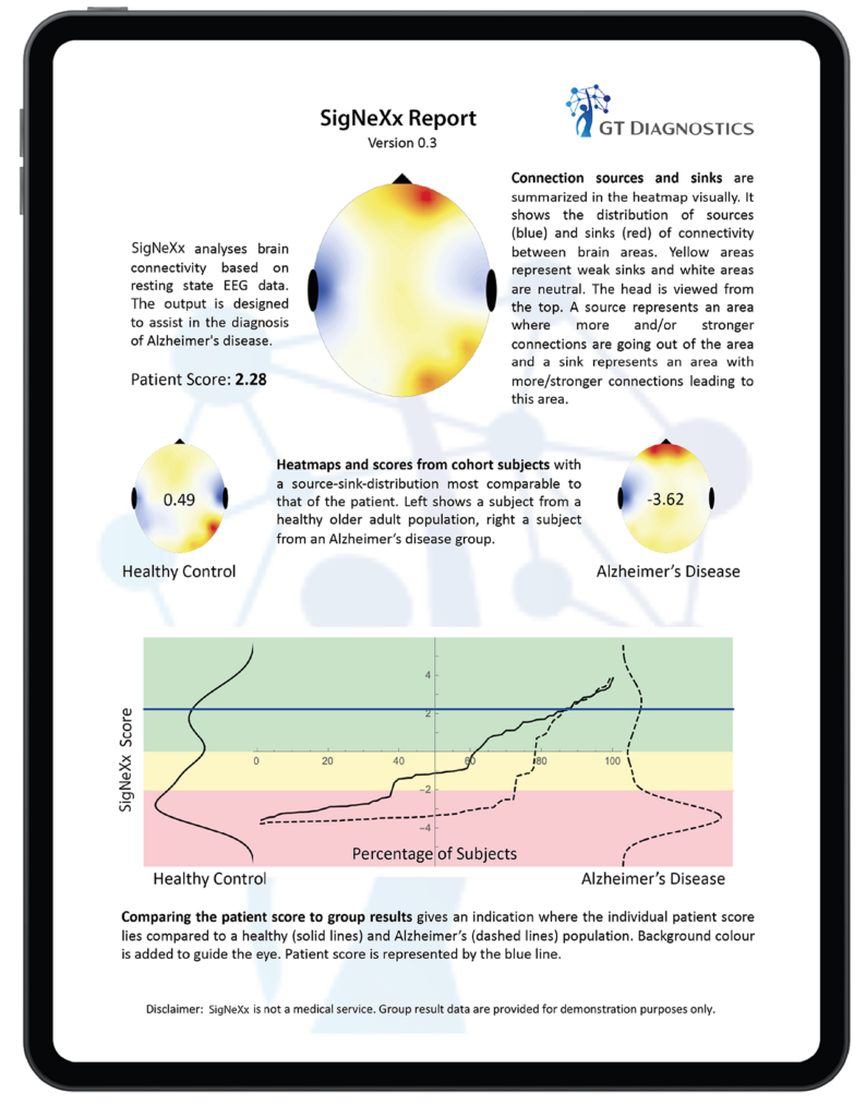 SigNeXx is a non-invasive, advanced electroencephalography(EEG)-based analysis tool, using standard EEG acquisition devices that provides an objective measure of brain connectivity. It will provide a data-analysis tool that delivers a quantitative evaluation of standard EEG recordings to aid in the diagnosis and monitoring of patients with dementia, in particular Alzheimer’s Disease.